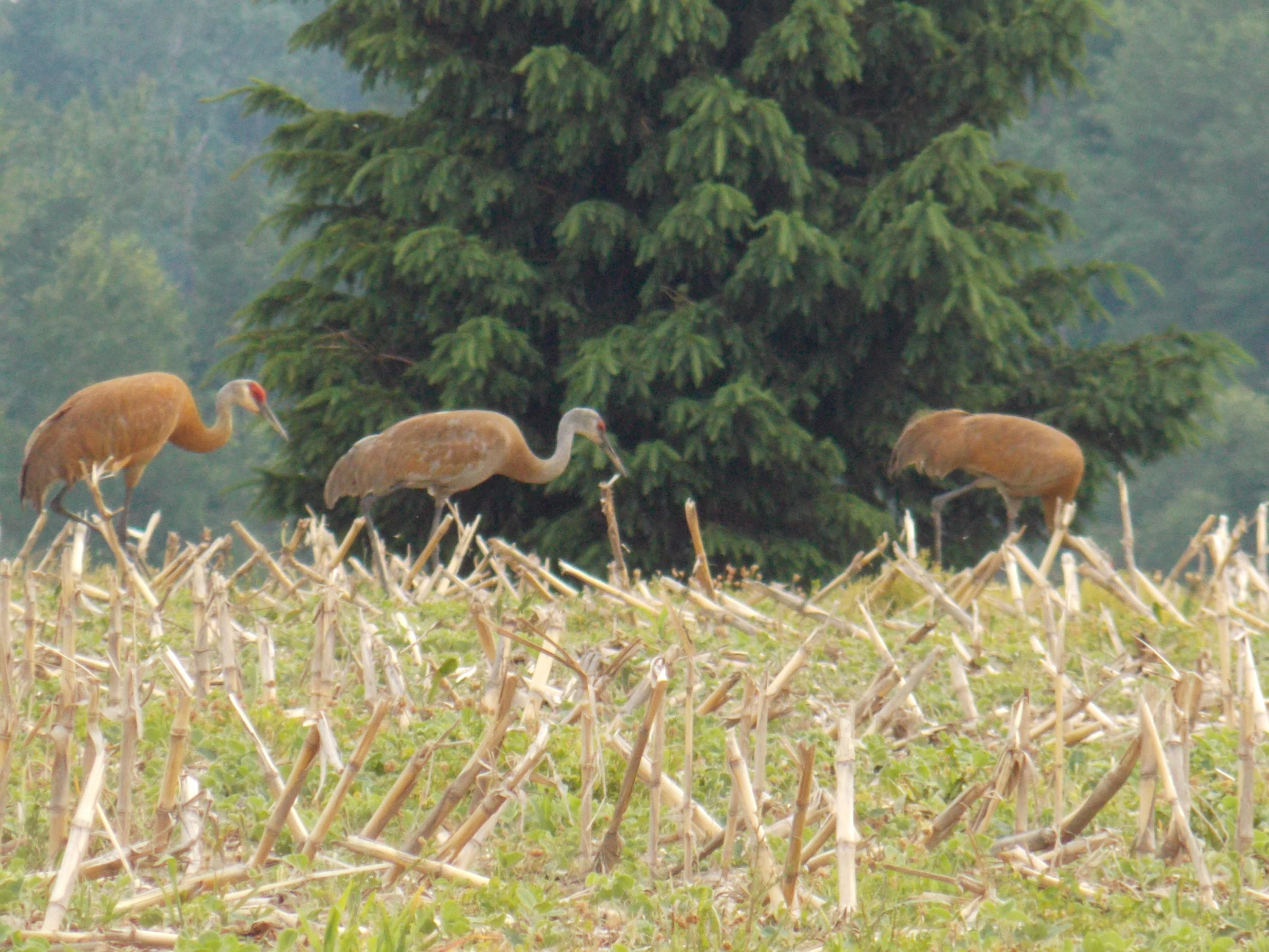 Wildlife like these Sandhill cranes forage through crop residue in late spring. No till and cover crops not only protect water quality and improve soil health and productivity, but provide vital habitat and forage for wildlife.