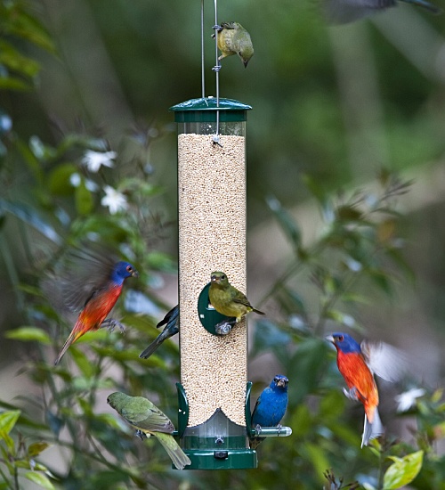 During summer, male birds such as these indigo and painted buntings are wearing their colorful breeding plumage. Photo by Bernard Friel.