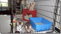 I let them run around in the grooming room, under supervision, for short periods now. As I weigh them regularly, I know they have grown, but I can't see it. The ones that are at least 2 lb will be going to the vet to be spayed and neutered on the 12th. May. Little "Precious", tabby/white, won't weigh enough, but she can go for a check-up anyway.